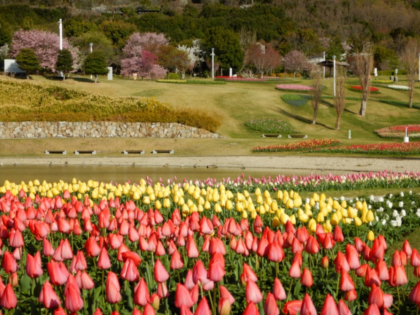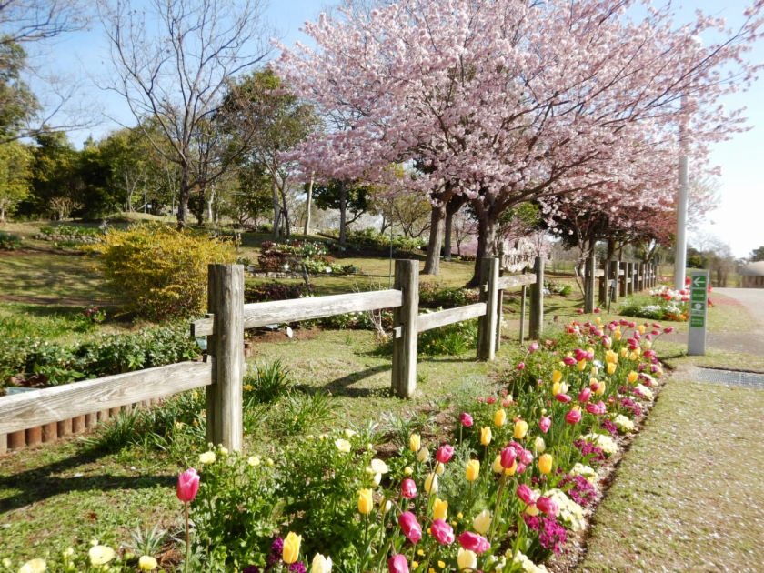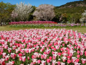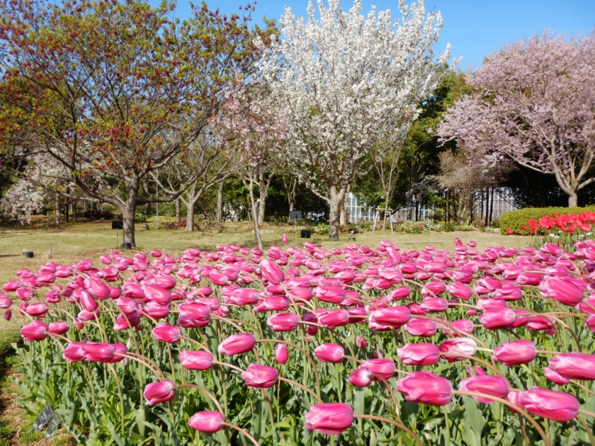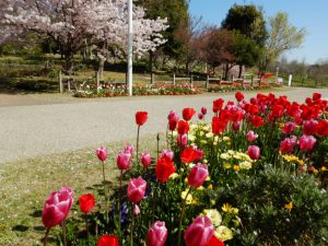 今なら桜もチューリップと一緒に楽しめる場所にたくさん咲いています。