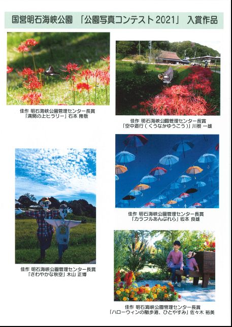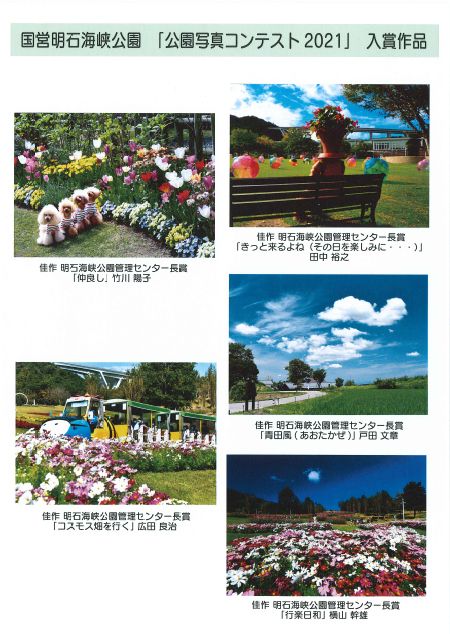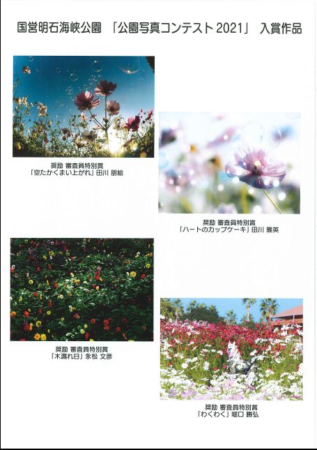 国営明石海峡公園(淡路地区・神戸地区)では、1月から11月の期間に撮影された淡路地区の美しい花風景や、神戸地区ののどかな里山風景をテーマに、6/21(月)~11/5(金)の期間「公園写真コンテスト2021」の作品を募集しました。神戸市や淡路市など県内各地や大阪府、奈良県など県外からの応募、年齢は10 代から80 代まで幅広く、今年は両地区で撮影された方が増え、計71名、237 点のご応募がありました。12/3(金)に、審査委員長武田峻彦氏(神戸芸術工科大学 映像表現学科 助教)をはじめ7名の審査員が審査を行った結果、23作品(最優秀2 点・奨励3 点・審査員特別賞8点・佳作10点)が入賞作品として選ばれました。