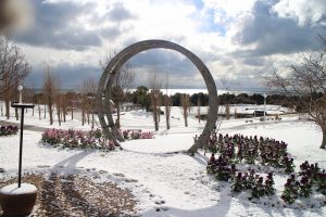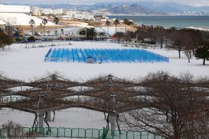 芝生広場は、一面銀世界の中に「ユニバーサル巨大迷路」の青がくっきり見えます。