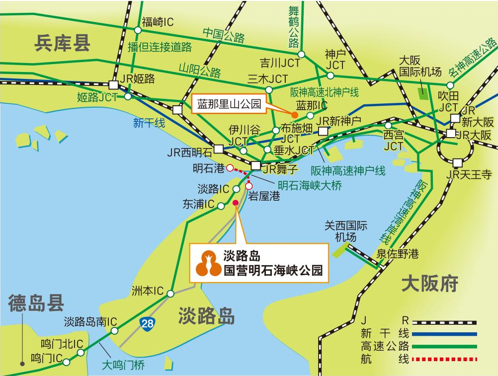 由阪神高速、第二神明道路换至神户淡路鸣门公路,然后从淡路I.C.下来,沿国道28号向南行驶约5分钟