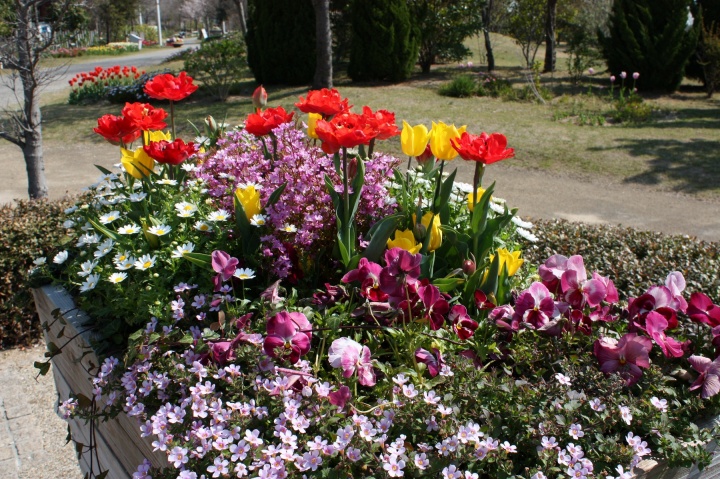 当季盛开的鲜花以红、黄、蓝、紫等五彩斑斓的颜色呈带状并排装饰着花坛,如彩虹一般。