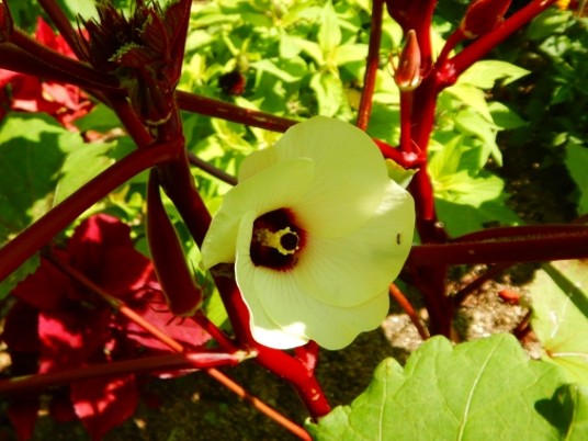 花の丘道に植えてある紅オクラの花が咲いていたので、その写真を添付しました。前者がハマボウ、後者がオクラ。どうです?そっくりですよね!