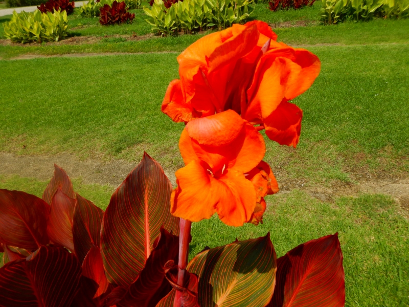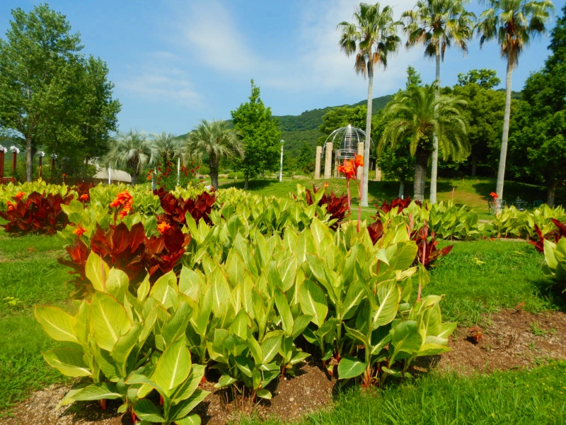 パームガーデンに植わっているカンナがスクスク育ち、花が咲き始めました。現在はまだ小さめで、ひざや腰の高さあたりで咲いています。秋ごろまでズズズズーーーーッと咲き続け、最後にはバスケの選手位の高さで花が咲きますよ!