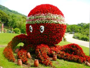 花の中海の周りに植わっているハンゲショウ(半夏生/半化粧)という植物の葉っぱが、この時期だけ(6月中旬~7月中旬くらい)白に染まります。特に当公園にはタコの形の立体花壇があり、‘二十四節気の半夏生の日にはタコを食べる’という風習がある関西地方には、まさにピッタリな取り合わせなのです。