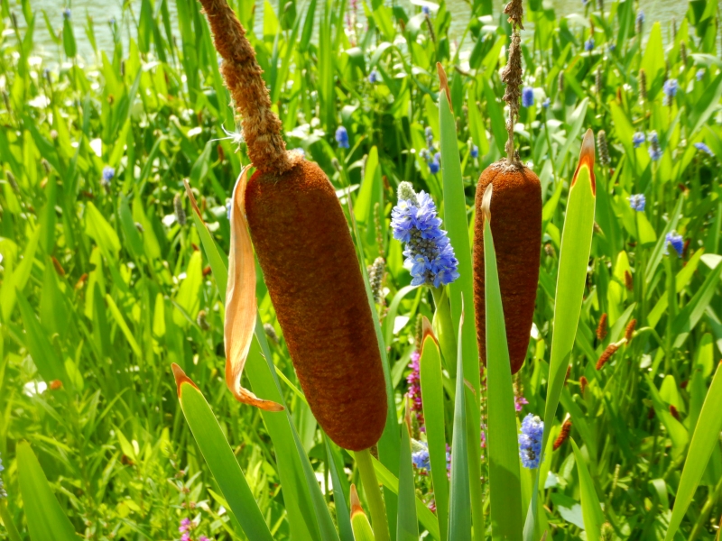 池の周りには、ハンゲショウ以外にもポンテデリア、ミソハギ、ガマと、それぞれ違った個性の植物も見ごろですので、是非ご覧くださいね。