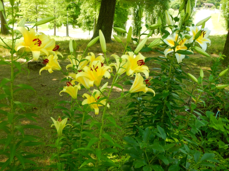 花の谷と松の谷の間の園路沿いに、オリエンタル系のユリ(有名なのは白い‘カサブランカ’)を200本以上植えており、ここ数日で咲き始めました。去年は背丈くらいで咲く大きな株が結構あったのですがイノシシに食べられてしまい、新たに植え替えたため今年はサイズ小さめです。しかし食べ残された株は大きく育ち、身長越えのものも(写真一枚目)。