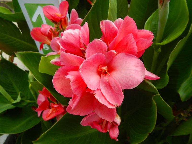 パームガーデンのカンナ(写真一・二枚目)は、写真では小さく見えますが、180㎝くらいあります。夏のイメージが強いヤシと一緒に夏の間ず~っと咲き続けています。