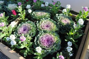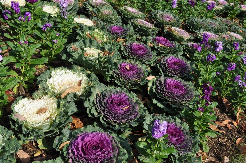 陽だまりの丘にて赤やピンク、紫色等色とりどりのストックのお花と、手のひらより大きな赤やピンク、白色のハボタンがご覧いただけます。