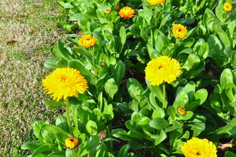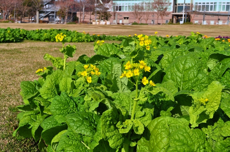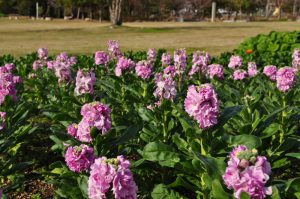 移ろいの庭では1月頃から見頃となる寒咲きナノハナが咲き始めました。黄・橙色のキンセンカやピンクや紫色のストックのお花もご覧いただけます。