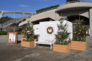 淡路口ゲート前 大きなリースとクリスマスツリー 足元にはストックとハボタン