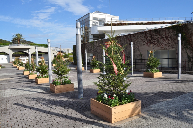 ビジター棟前の広場には18本のツリーが並んでいます。連絡口ゲートの前のツリーの足元はシクラメンやシロタエギク等で華やかに装飾しています。