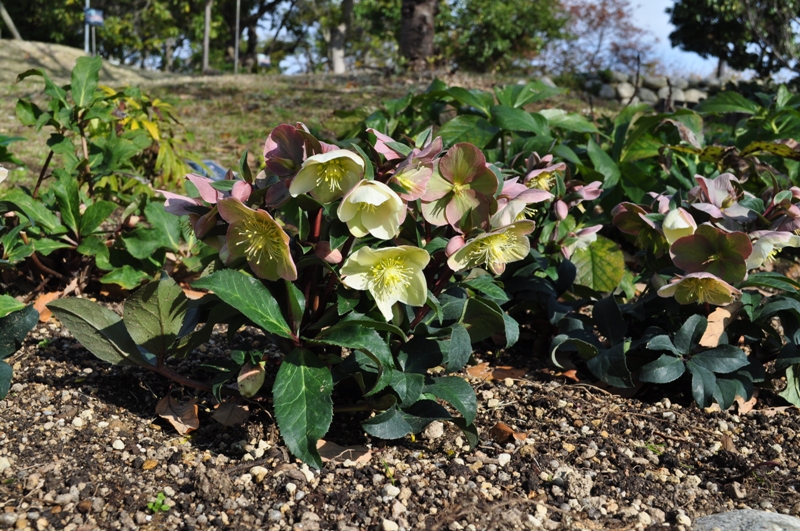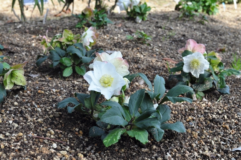 花の丘道(クリスマスローズガーデン)にて白花の原種系クリスマスローズ・ニゲルなどが咲き始めました。これから春にかけて様々なクリスマスローズがご覧いただけます。