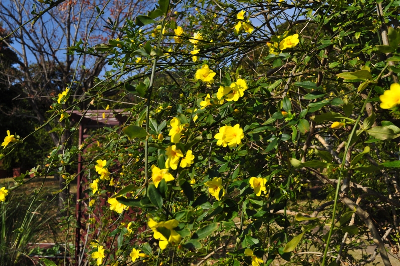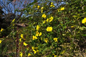 花の丘道 枝垂れた枝に黄色のお花 ウンナンオウバイ(雲南黄梅) 咲き始め