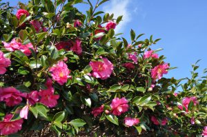 移ろいの庭・東浦口ゲート周辺他 濃ピンク色の八重咲き カンツバキ(寒椿)
