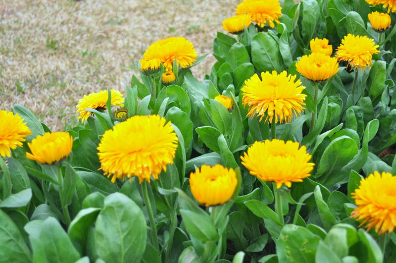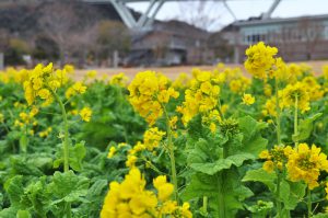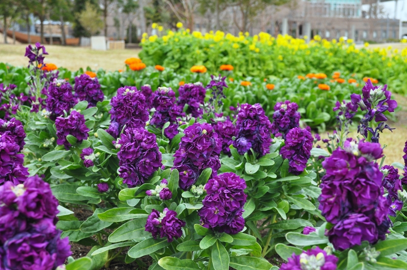 移ろいの庭では寒咲きナノハナが見頃となっています。黄・橙色のキンセンカやピンクや紫色のストックのお花もご覧いただけます。