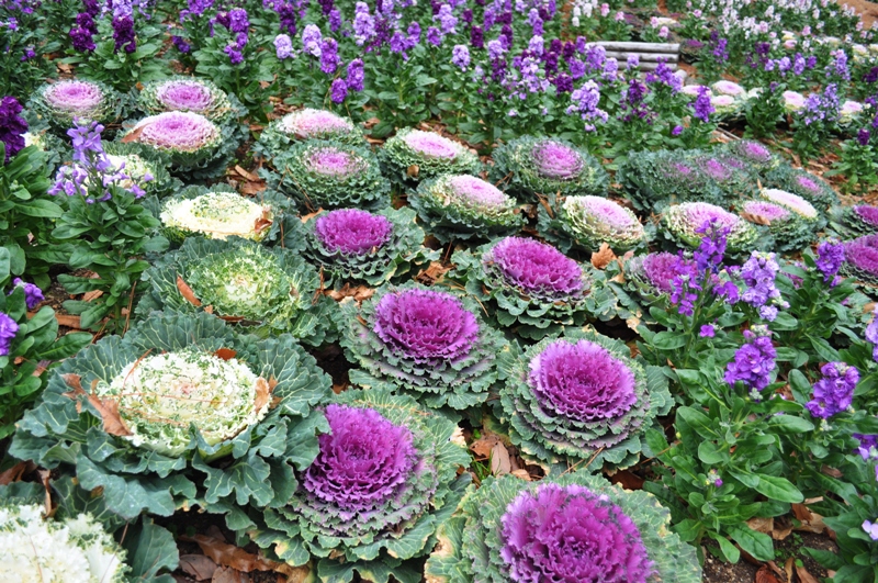 陽だまりの丘にて赤やピンク、紫色等色とりどりのストックのお花と、手のひらより大きな赤やピンク、白色のハボタンがご覧いただけます。