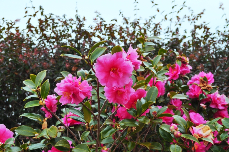 移ろいの庭・東浦口ゲート周辺他 濃ピンク色の八重咲き カンツバキ(寒椿)