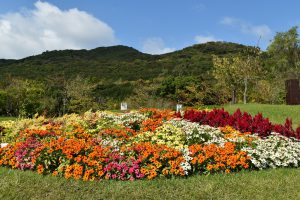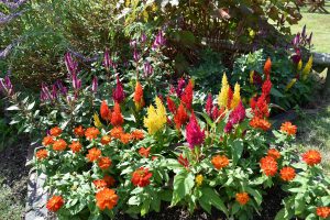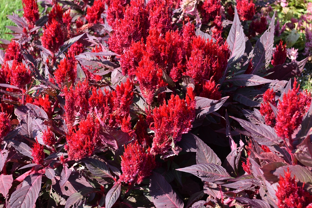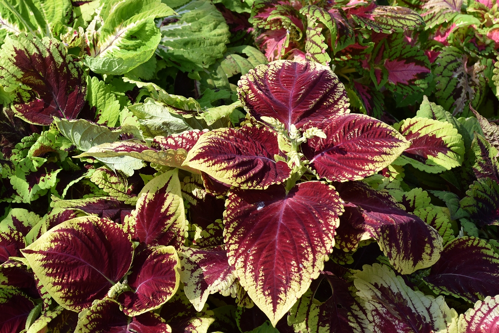 ポプラの丘・花の丘道他 多彩な色が混じったコリウスと赤・紅・橙・黄色が秋らしいケイトウ