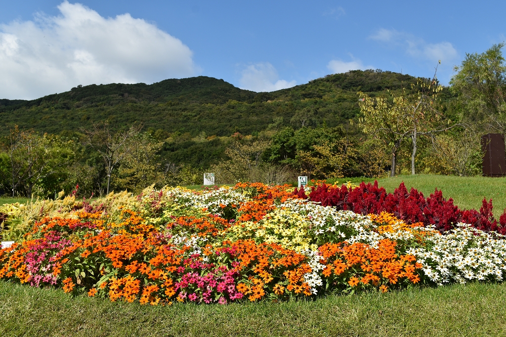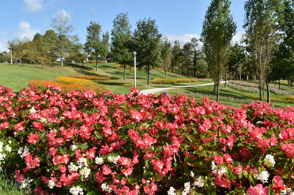 ポプラの丘の東屋周辺では、大きな赤・桃・白色の鮮やかな花のベゴニアや赤橙黄色のビタミンカラーのキバナコスモス、赤やピンクの花穂がきれいなケイトウ、橙や黄色のジニアなどがご覧いただけます。