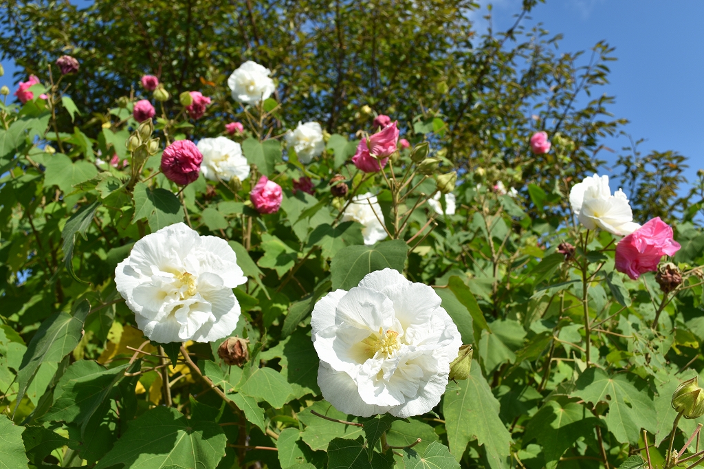 ポプラの丘 白から濃ピンク色へ時間が経つと色変わりする スイフヨウ(酔芙蓉)