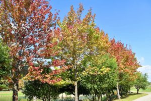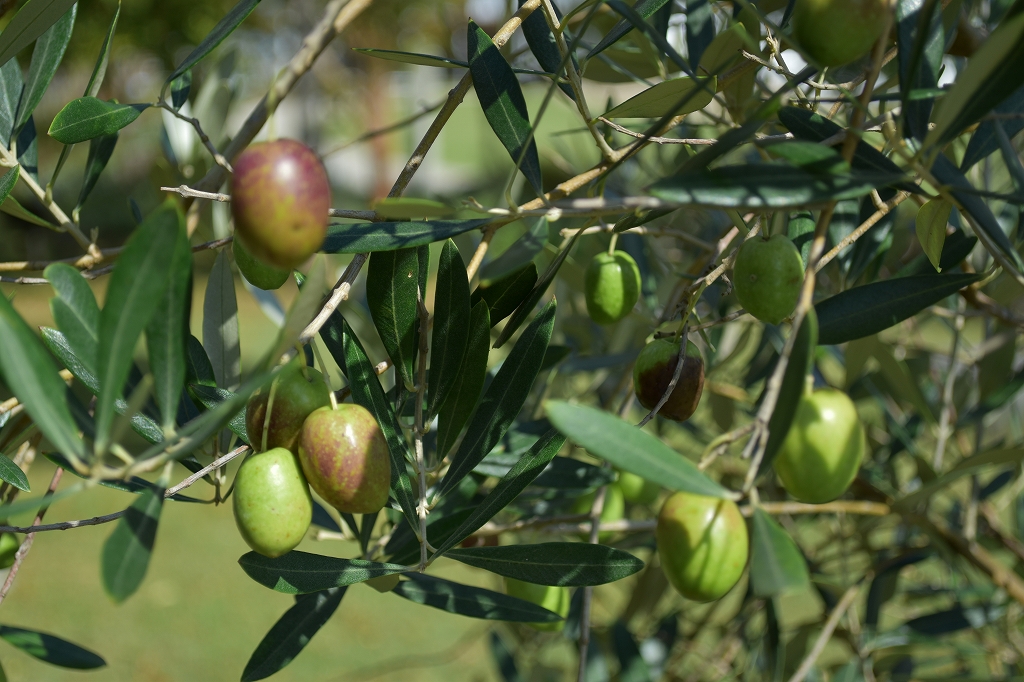 東浦口周辺 日増しに色づいてきたモミジバフウと移ろいの庭のオリーブの実