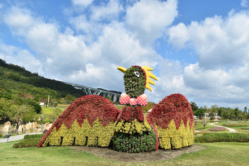立体花壇「花火鳥」&「タコトピアリー」 赤と黄色に紅葉したカラーリーフ アキランサス
