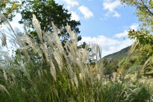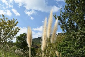 移ろいの庭 秋空に映えるパンパスグラスとススキの穂