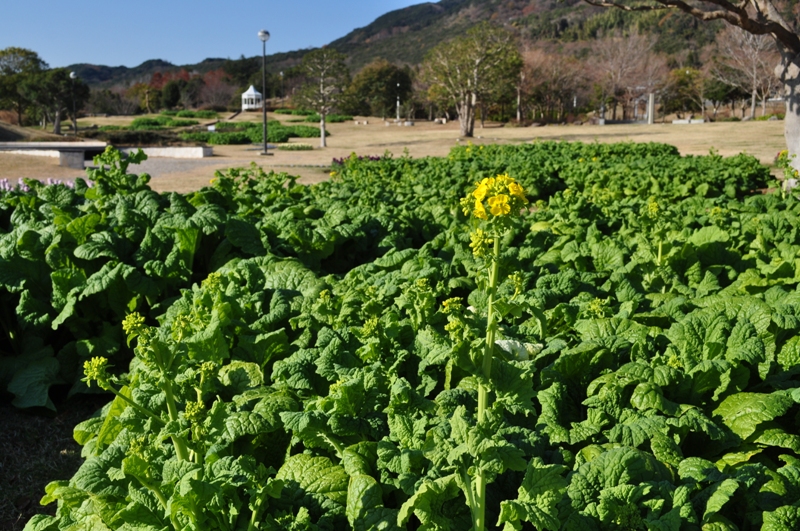 移ろいの庭の花型花壇にて冬から開花する寒咲きナノハナが開花を始めました!