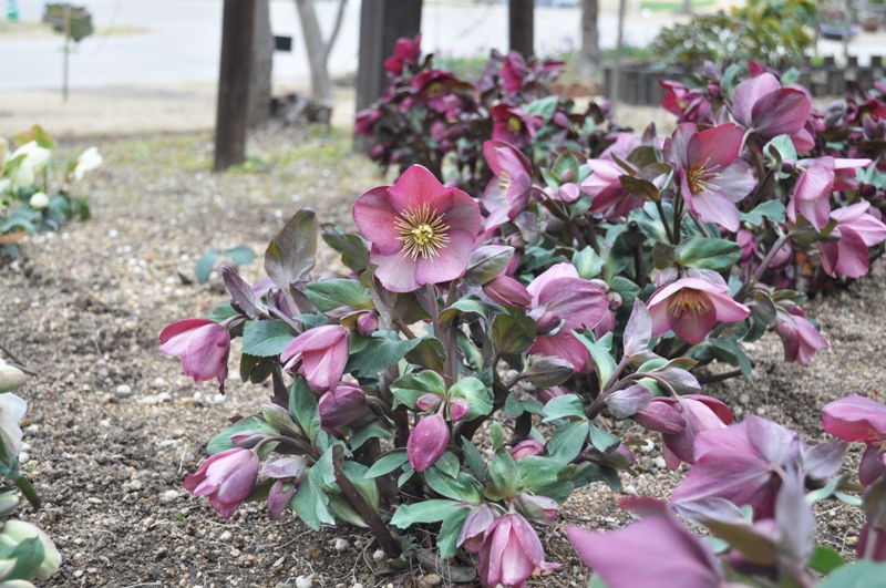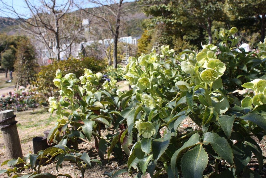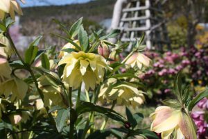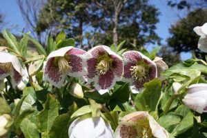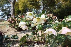 花の丘道(クリスマスローズガーデン)にて、淡いクリーム色のニゲルコルスや、ピンク色・赤色など様々なクリスマスローズがご覧いただけます。