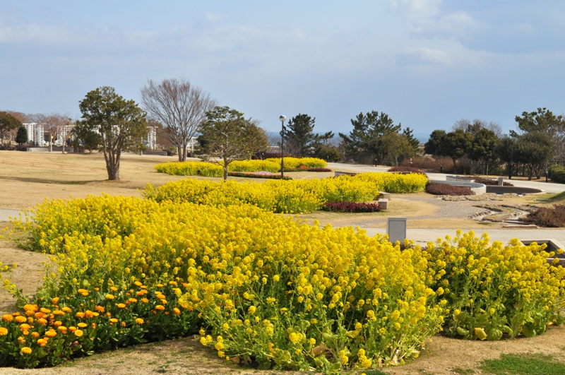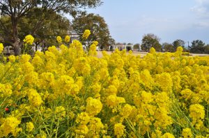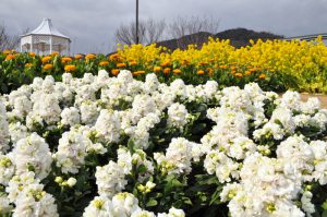 移ろいの庭では寒咲きナノハナが見頃です。黄・橙色のキンセンカやピンクや紫色のストックのお花もご覧いただけます。