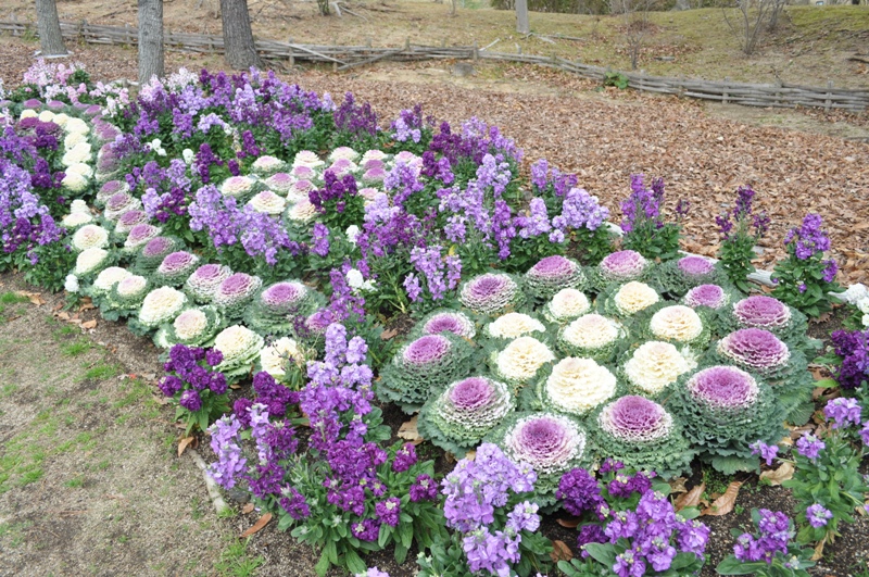 陽だまりの丘にて赤やピンク、紫色等色とりどりのストックのお花と、手のひらより大きな赤やピンク、白色のハボタンがご覧いただけます。