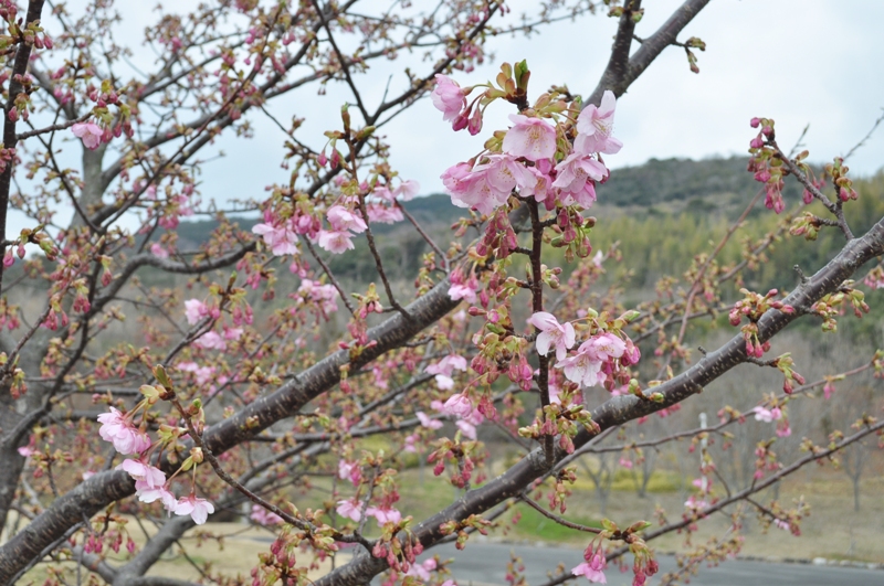 春一番の丘で早咲きで濃桃色のカワヅザクラ(河津桜)が開花を始めました。見頃は3月上旬からの予想です。