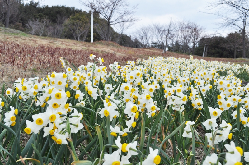春一番の丘にて赤色のウメと桃色のシダレウメが見頃となっています。また白色のシダレウメ野お花も咲き始めています。ウメの周囲ではニホンスイセンのお花が見頃となっています。