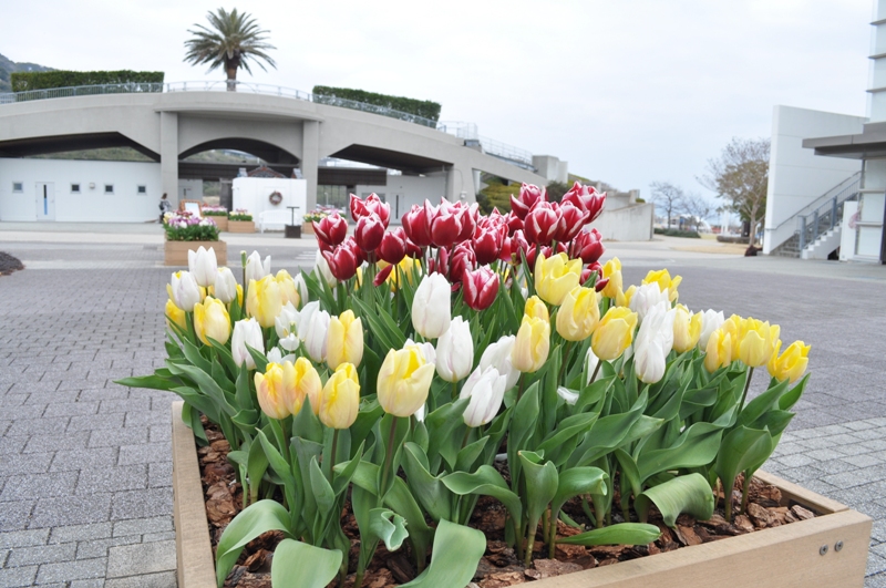 淡路口ゲート~ビジター棟前のマス型の花壇、連絡口ゲート周辺等で、「アイスチューリップ」がご覧いただけます!