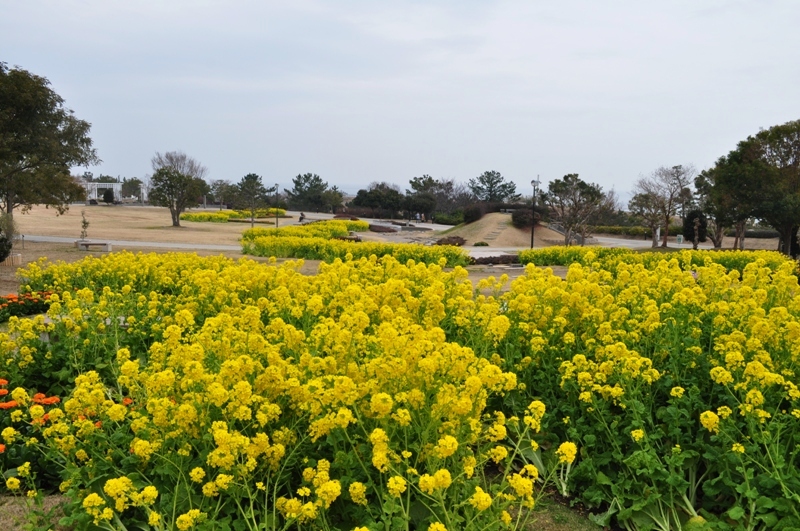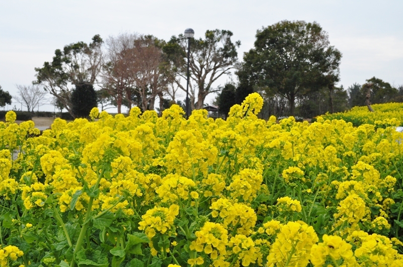 移ろいの庭では寒咲きナノハナが見頃です。黄・橙色のキンセンカやピンクや紫色のストックのお花もご覧いただけます。