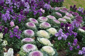 陽だまりの丘にて赤やピンク、紫色等色とりどりのストックのお花と、手のひらより大きな赤やピンク、白色のハボタンがご覧いただけます。