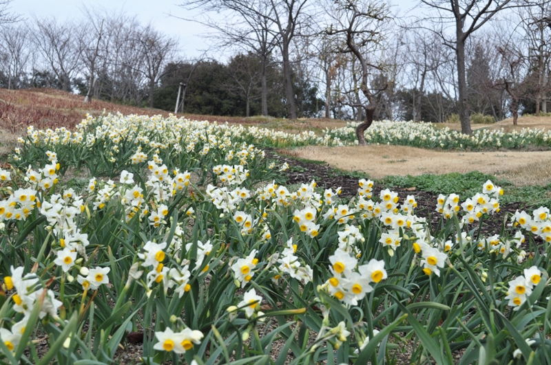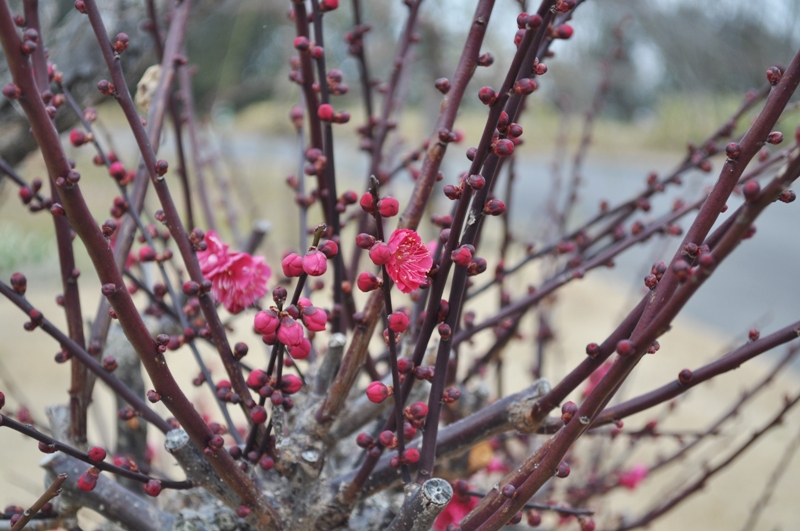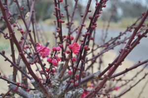 春一番の丘にて赤色のウメと桃色・白色のシダレウメが咲き始めました。ウメの周囲ではニホンスイセンのお花が見頃となっています。