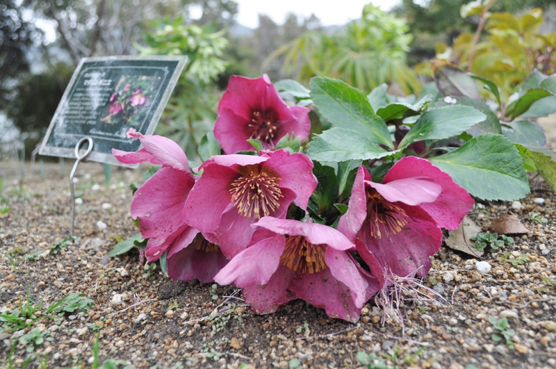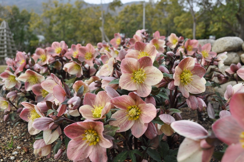花の丘道(クリスマスローズガーデン)にて、淡いクリーム色のニゲルコルスや、ピンク色・赤色など様々なクリスマスローズがご覧いただけます。