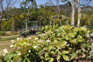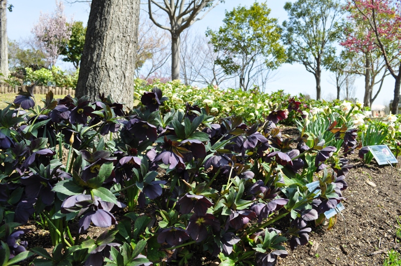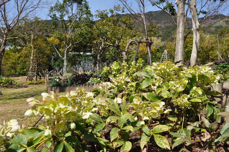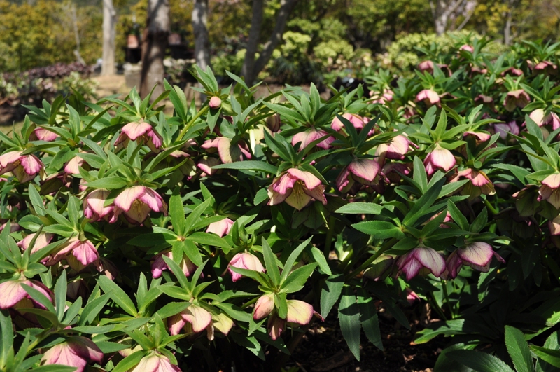 花の丘道(クリスマスローズガーデン)にて、淡いクリーム色のニゲルコルスや、ピンク色・赤色など様々なクリスマスローズがご覧いただけます。