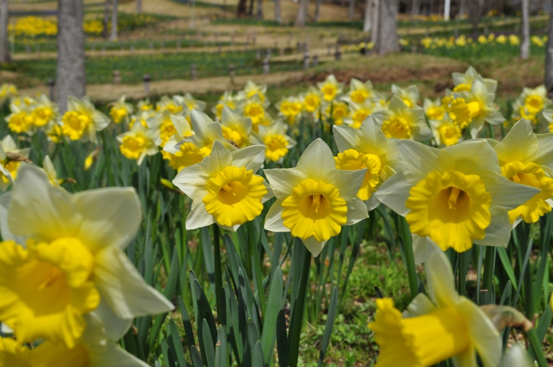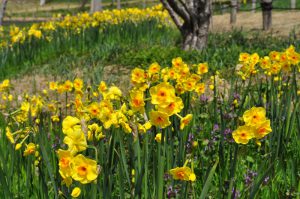 陽だまりの丘にて大輪のラッパスイセンなど様々なセイヨウスイセンが開花を始めました。