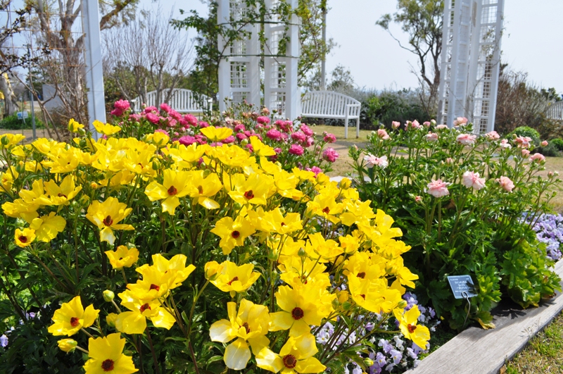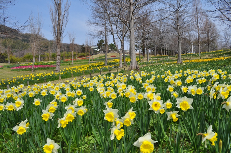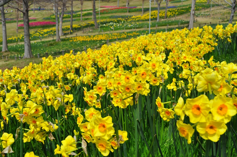 陽だまりの丘にて大輪のラッパスイセンなど様々なセイヨウスイセンが見頃となっています。