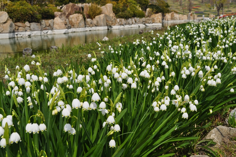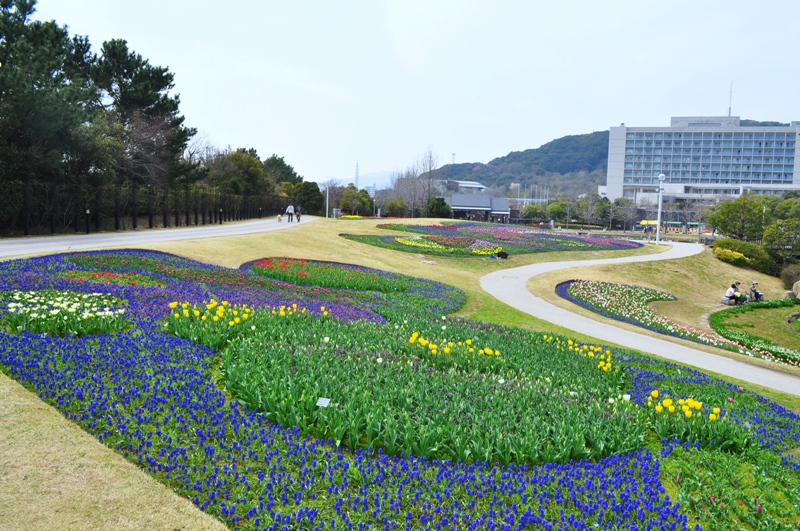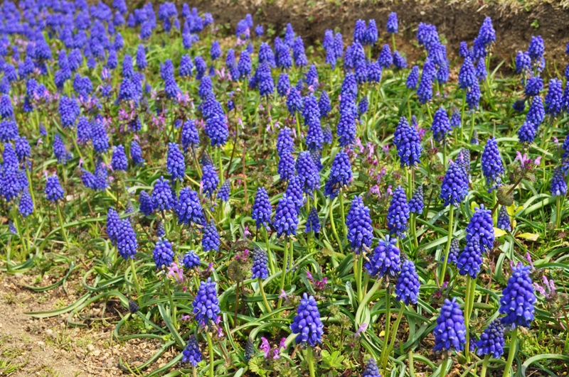 ◆大地の虹(南)エリア  早咲きチューリップが咲き始め、ムスカリは見頃です。花の中海沿いでは小さなベル型のお花スノーフレークも見頃となっています