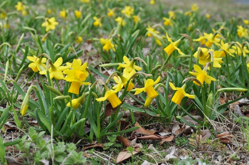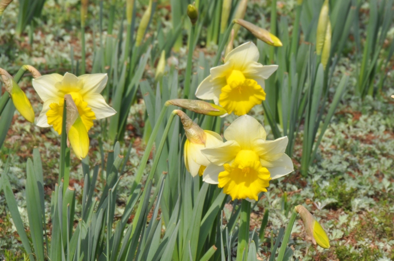 陽だまりの丘にて大輪のラッパスイセンなど様々なセイヨウスイセンが開花を始めました。