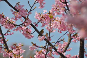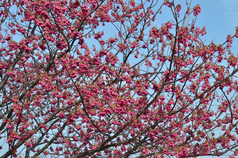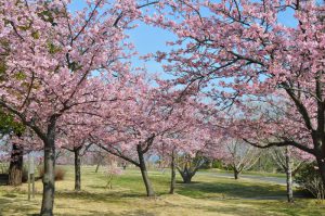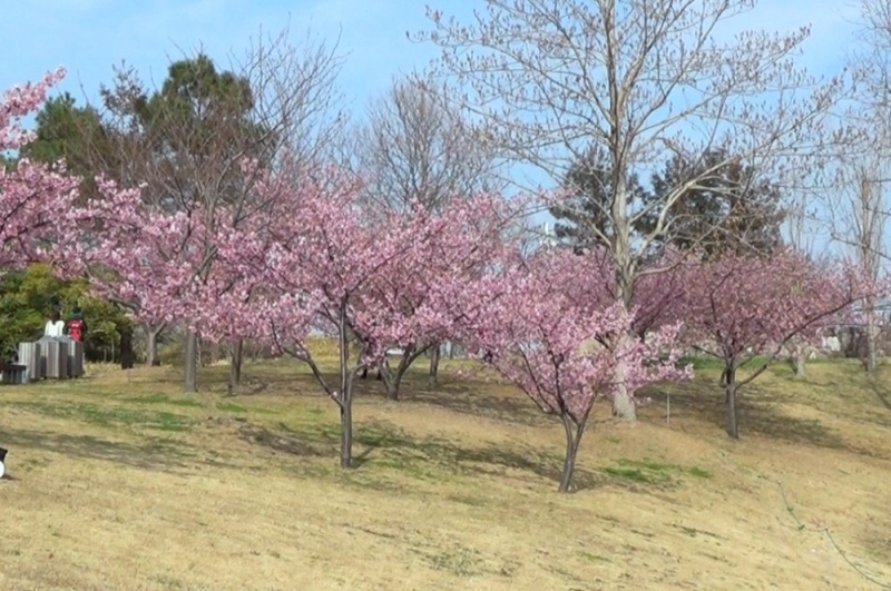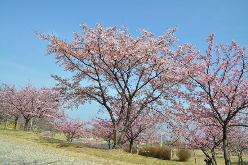 春一番の丘~ポプラの丘にて早咲きで濃桃色のカワヅザクラ(河津桜)が見頃となっています。