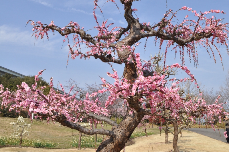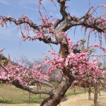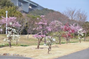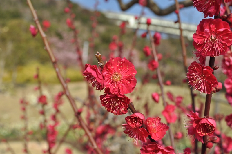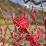 春一番の丘にて赤色のウメと桃・白色のシダレウメが見頃となっています。
