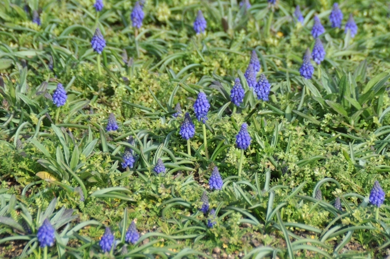 大地の虹・ポプラの丘など大きな花畑では今チューリップを育成中です。ポプラの丘等では青紫色のムスカリが咲き始めました。