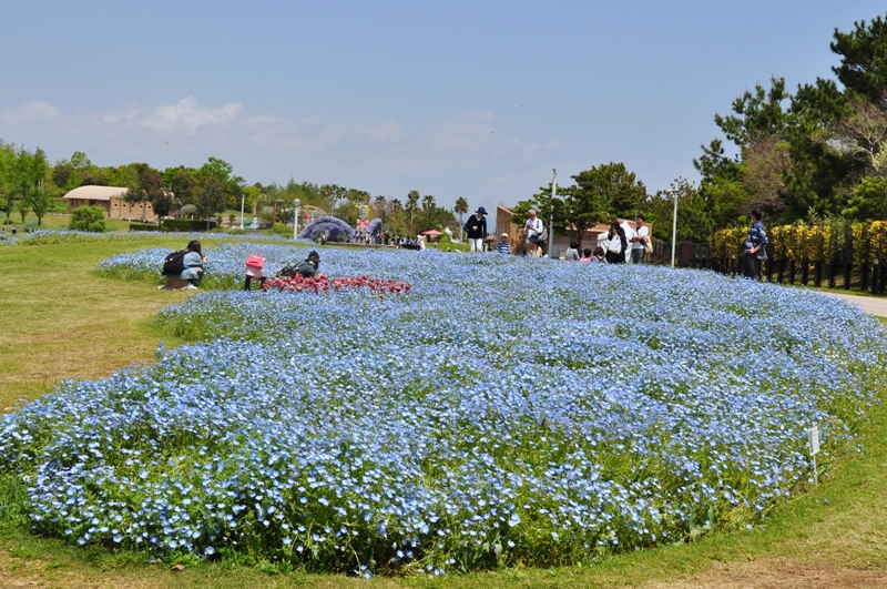 ピークは過ぎ、花数は減ってきましたがポプラの丘、大地の虹(南)エリアにて淡青色と白色のネモフィラがまだ綺麗にご覧いただけます。