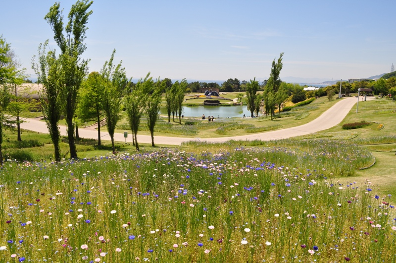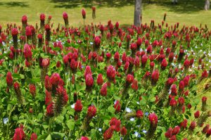 ポプラの丘のネモフィラは見頃のピークが過ぎ、花数が減っています。その他、ヤグルマギクやクリムソンクローバー等が見頃となっています。
