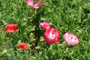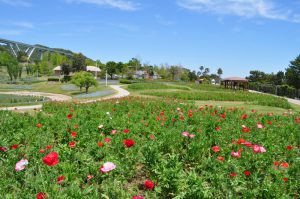 大地の虹(北)エリアにて赤やピンク色の薄い紙の様な花びらが特徴のシャーレポピー(ヒナゲシ:雛罌粟)のお花が咲き始めました。