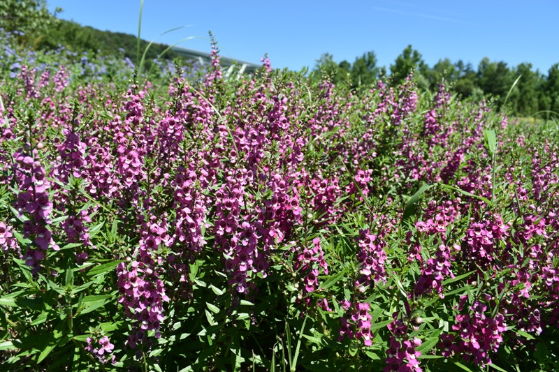 涼しげな青紫色と白色のアゲラタムや青・紫・桃・白色のアンゲロニアのお花が見頃です。